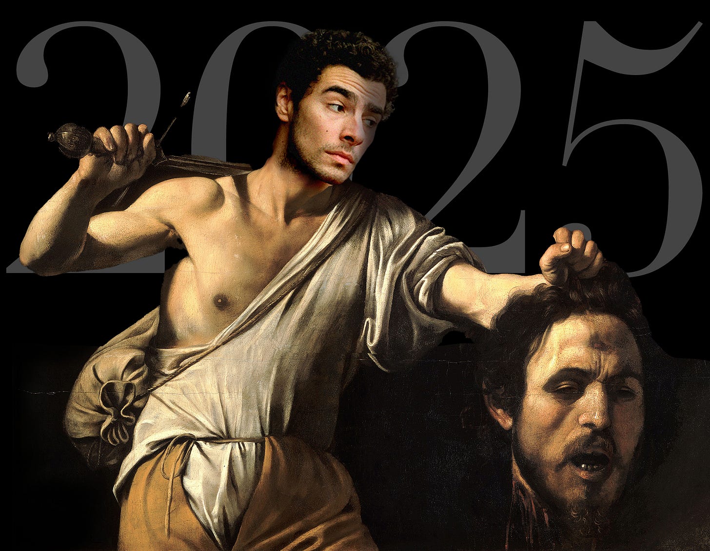 Opening collage by FW ©2025, Nightcharm, Inc. Main painting, David with the Head of Goliath, c. 1606-1607, by Caravaggio. Kunsthistorisches Museum, in Vienna. Luigi portrait via YouTube screen cap.