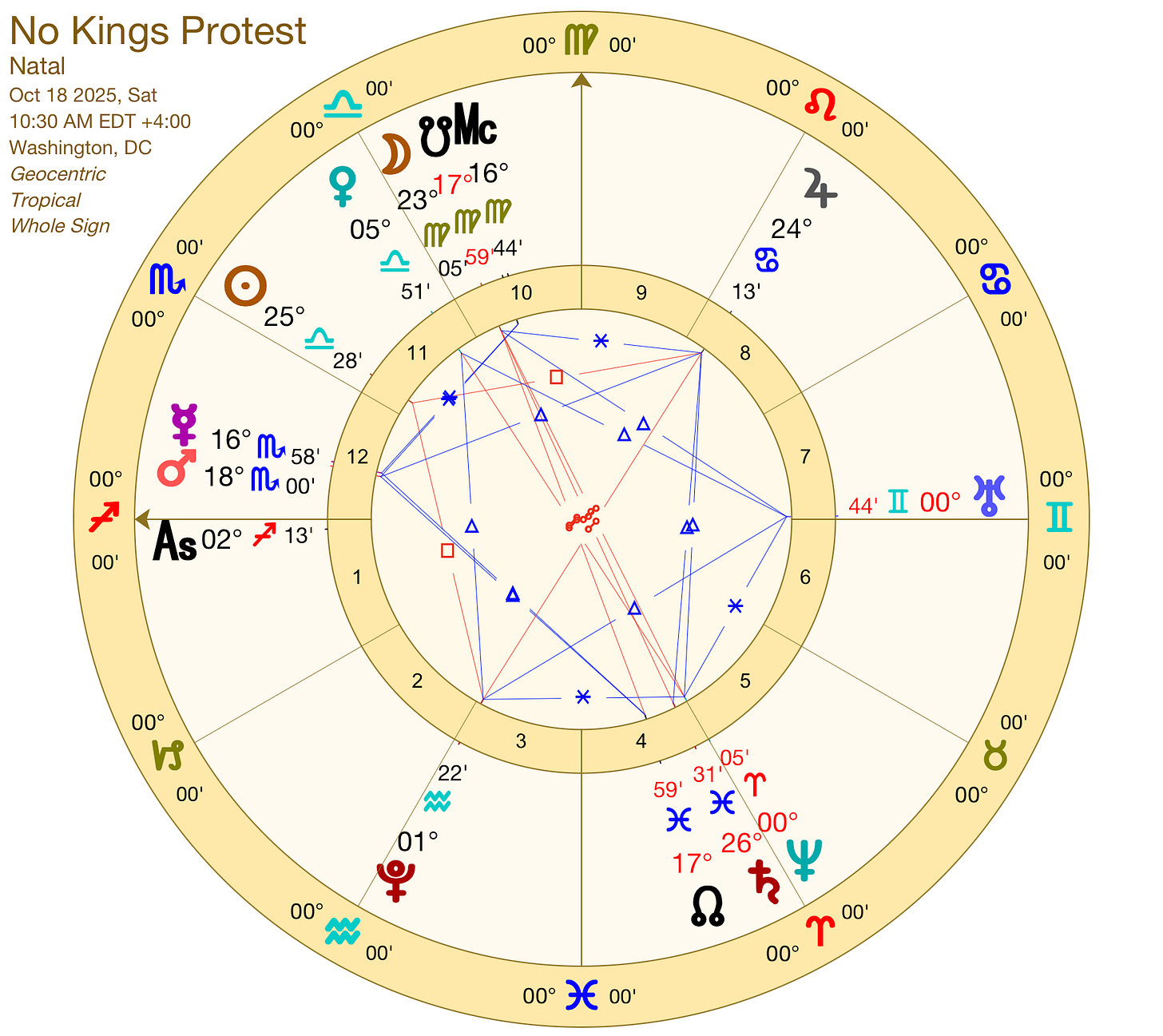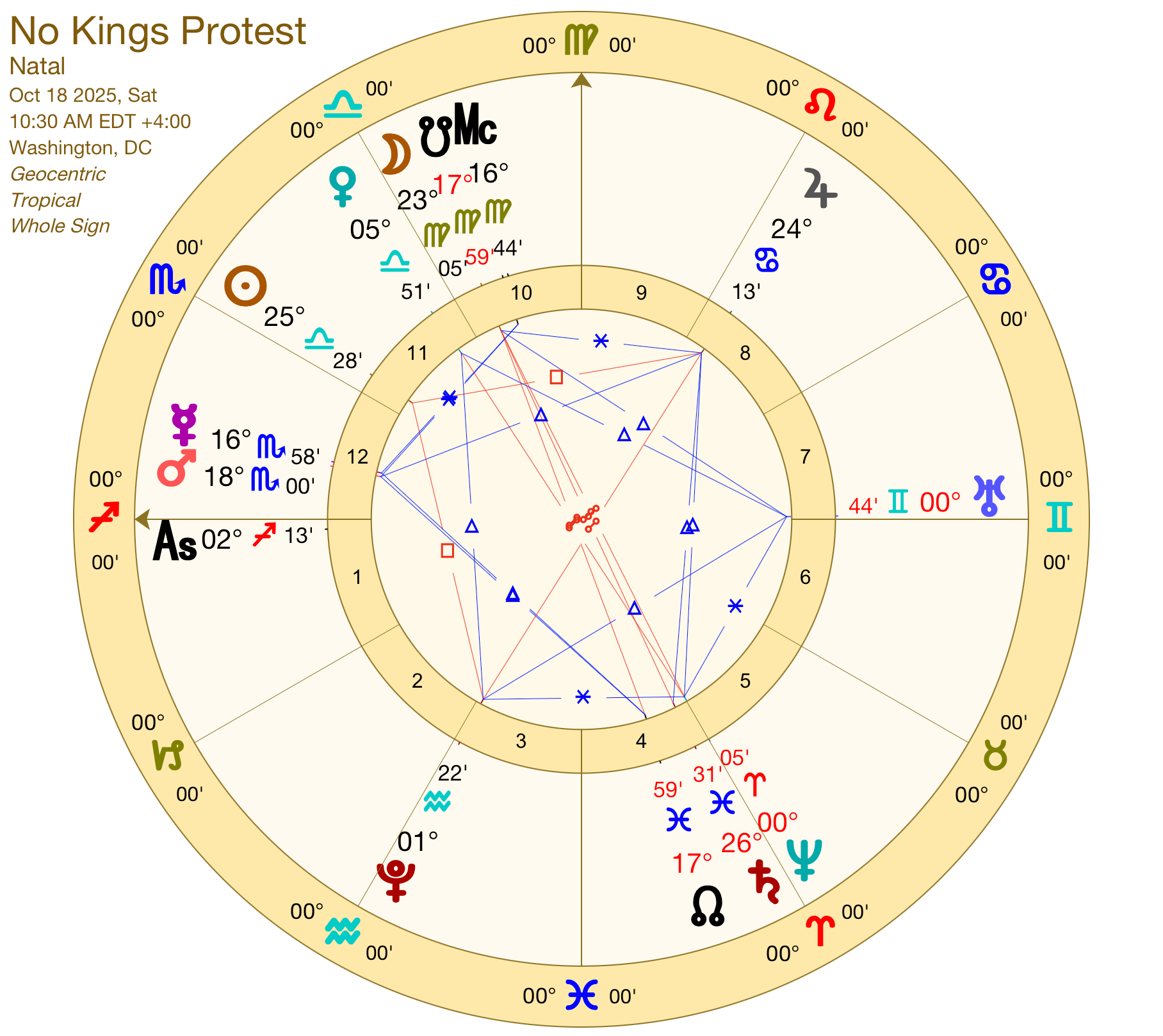 THE OCTOBER 18 PROTESTS are intended as a second wave of national demonstrations following the first No Kings march held back in June of this year. The astrology for tomorrow’s demonstration is fraught with opposition and sketchy, behind-the-scenes machinations. Some consider this the tipping point that Trump’s waited for to unleash the Insurrection Act—a federal law that authorizes the president to deploy the military domestically for law enforcement purposes—to suppress rebellion or domestic violence.