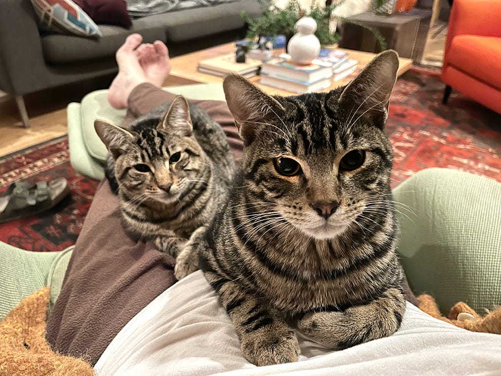 I kept the names that the foster family that was housing them had given them: George (after Curious George, and Jesus Christ, is that fitting—he’s discovered items in my house that I didn’t even know had gone missing) and Maze, because of the crazy-gorgeous patterns on his coat.