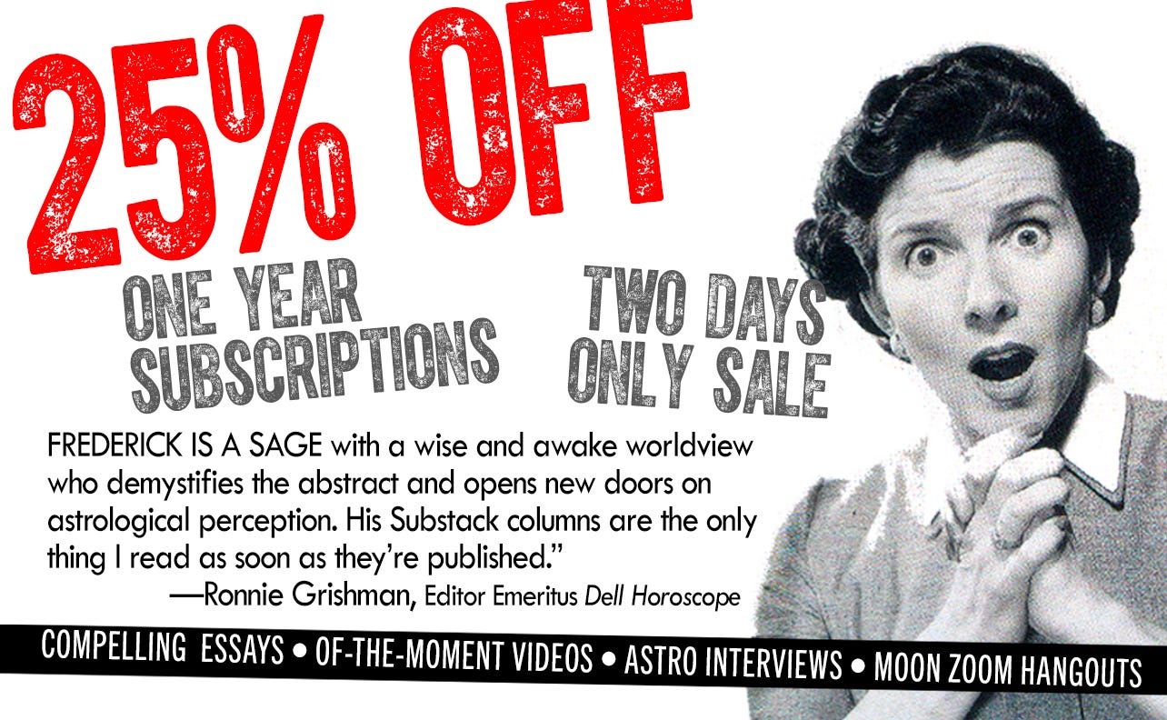 I HAD A BANG-UP time yesterday with astrologer over on her YouTube channel, Lawless Astrology. We took on the new tranche of Epstein files by studying the transits to both Trump’s and the US’s natal charts. Toss in the incendiary Scorpio new Moon on the 20th, and, wow, fasten your seatbelts. (And don’t ask me how, but somehow Lorena Bobbitt made her way into our convo.)